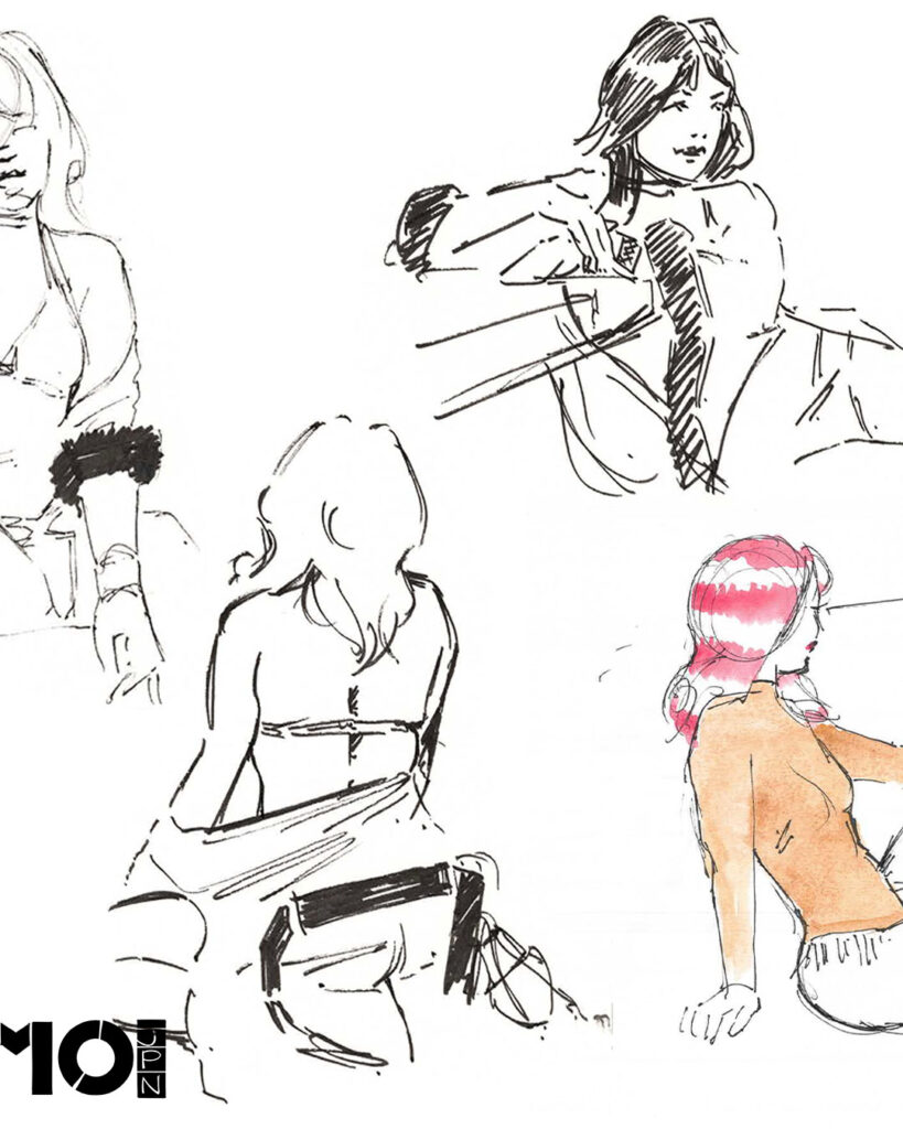 All pieces were made with Pigma Micron ink and watercolour on printer paper. Using simple materials keeps the process direct and responsive, which suits the pace of a live event. The line quality from Micron pens and the transparent layering of watercolour helped preserve movement while adding shape, contrast, and atmosphere.