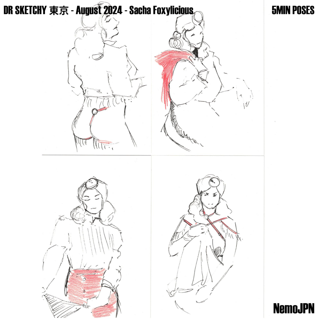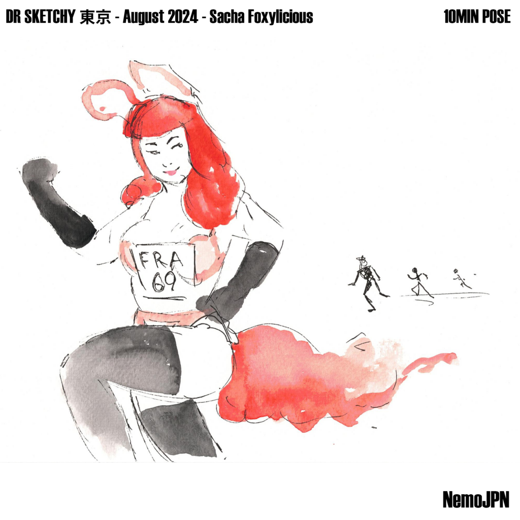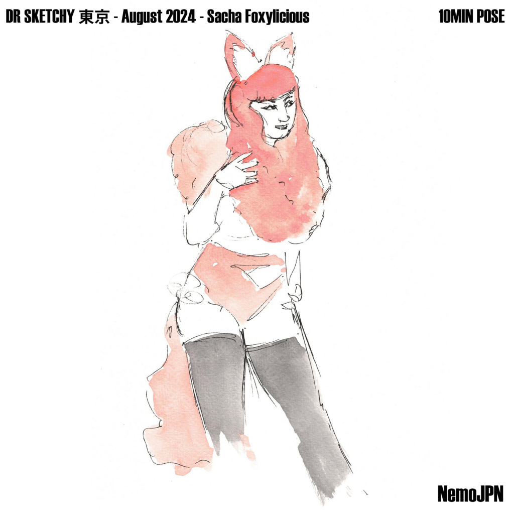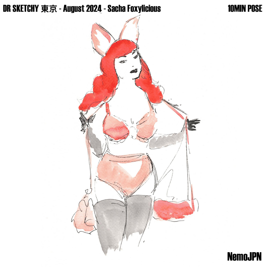 A playful set of ink and watercolour figure studies from Dr Sketchy’s Anti-Art School in Tokyo, featuring model Sacha Foxilicious.